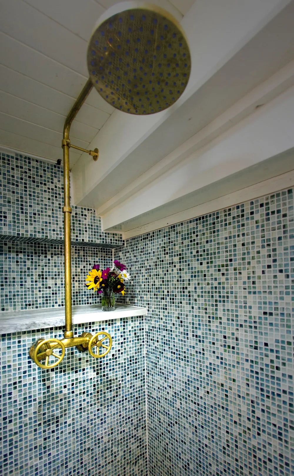 The bespoke fixtures are made of solid bronze. We chose tiled walls and floors accented with Carrara marble.